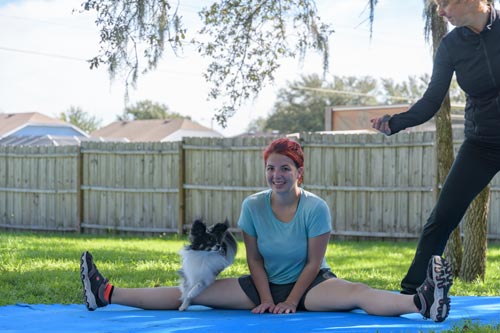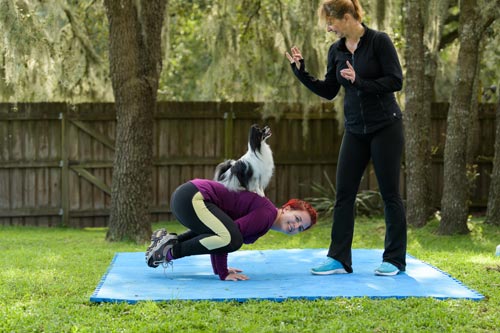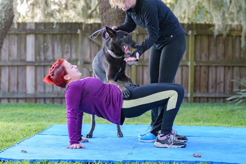 - Load – dog stands, sits or downs on human while human performs an exercise